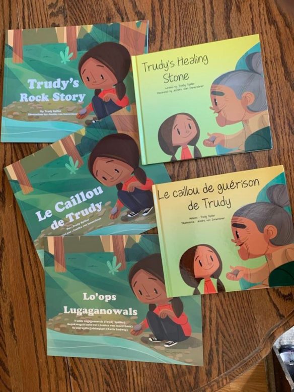 In 2012 Trudy began sitting in on Tanisha and Terrance’s show and tell classes and ultimately became a Role Model for SD62. As a SD62 First Nation role model, Trudy educates all children about First Nation medicine, food and dress. She feels that ALL children should have the right to learn about First Nations. During this time, Trudy was encouraged by many teachers to write a book. So in 2016, with the assistance of a well-known publisher, Teddy Anderson, Trudy began to write her book, Trudy’s Rock Story. It was a story told to her and her siblings by their grandmother as she whipped soapberries under a gas or coil oil lantern.Trudy’s Rock Story is in English, French and Gitsenimx. Two years later Trudy wrote Trudy’s Healing Stone in English and French. Trudy’s Rock Story and Trudy’s Healing Stone can be found in bookstores across Canada.